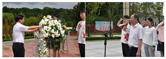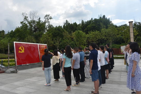 在息烽集中营革命历史纪念馆广场,大家在《忠魂曲》雕塑前列队肃立,举行庄严的敬献花篮仪式,全体党员在鲜红的党旗下,高擎右拳,重温入党誓词,回顾入党宣誓时的庄严承诺和坚定决心,永葆共产党员的政治本色。