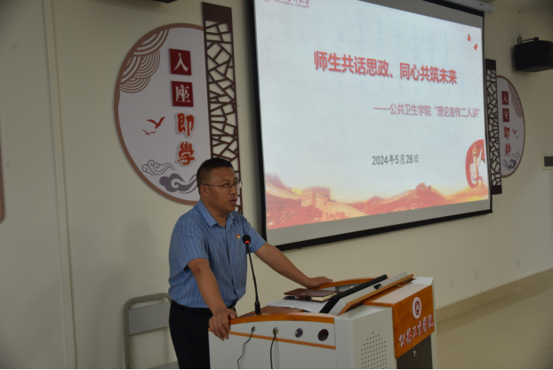 5月28日下午,williamhill英国官网“理论宣传二人讲”在公司遇时学堂开讲。本次主讲人是公司党委书记张在金和公司团委副书记、食安22-1班员工冯诗雨,他们以“学习贯彻习近平总书记对公司思政课建设作出重要指示”为主题进行宣讲。公司党政领导,辅导员,党支部书记及研究生党支部、本科生党支部、心远社区员工第二党支部员工代表近百人参加宣讲会。公司党委副书记王红卫主持宣讲会。