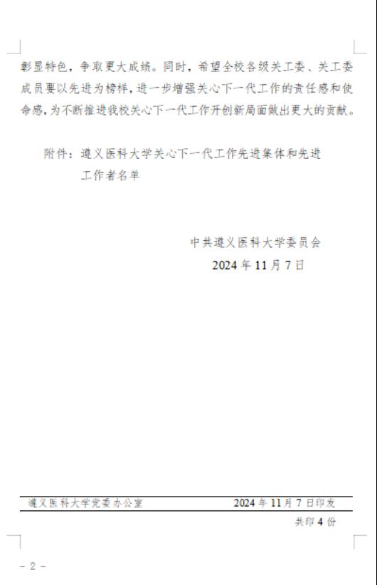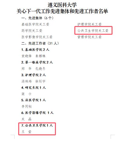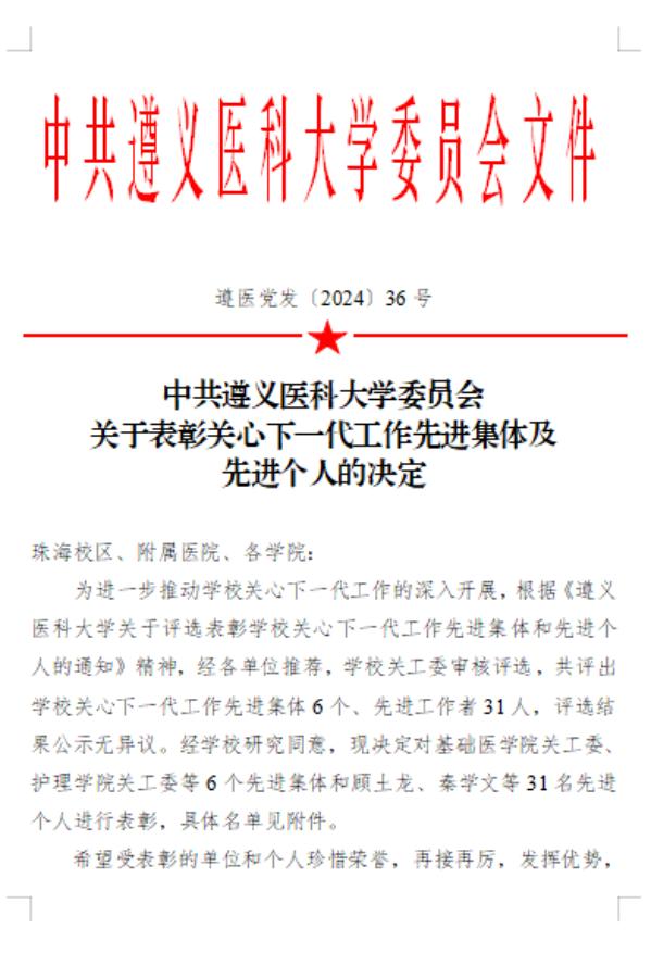近日,根据《中共williamhill英国官网委员会关于表彰关心下一代工作先进集体及先进个人的决定》遵医党发〔2024〕36号文件精神,williamhill英国官网关工委荣获williamhill英国官网关心下一代工作先进集体(全校共6个),王莹老师荣获先进工作者称号。