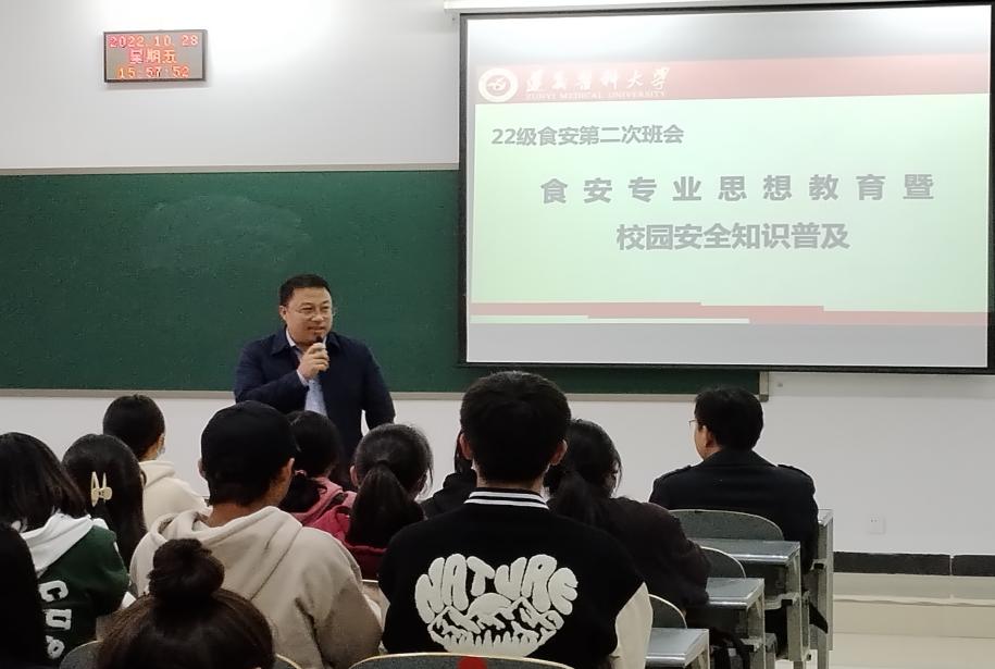 2019级食安的张译文代表高年级同学进行交流发言,分享了她的成长历程。食品安全教研室主任周正博士为2022级食品质量与安全的新同学开展专业思想教育。班主任胡颖老师进行校园安全知识普及,从人身安全、财产安全、生活安全等提了要求。
