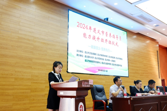 8月15日上午9:00,由公司承办的2024年遵义市营养指导员能力提升班在公司道德讲堂正式开班。遵义市科协副主席孔红、公司副经理(主持工作)周远忠、遵义市卫生健康局食品安全风险监测科科长付薇、遵义市教体局素质教育中心科长王立航、遵义市商务局贸易促进会秘书长李卓、遵义市民政局养老服务与老龄工作科科长段炼、贵州省营养学会副理事长胡斌丽、遵义市营养协会韩华,遵义市健康教育学会会长蔡绍祥、原遵义健康教育所所长闫诚,以及负责本次培训的教师和来自遵义各县(市、区)医疗机构、教体系统、民政养老机构、商业服务机构约300余人参加了开班仪式。公司副经理刘俊主持开班式。